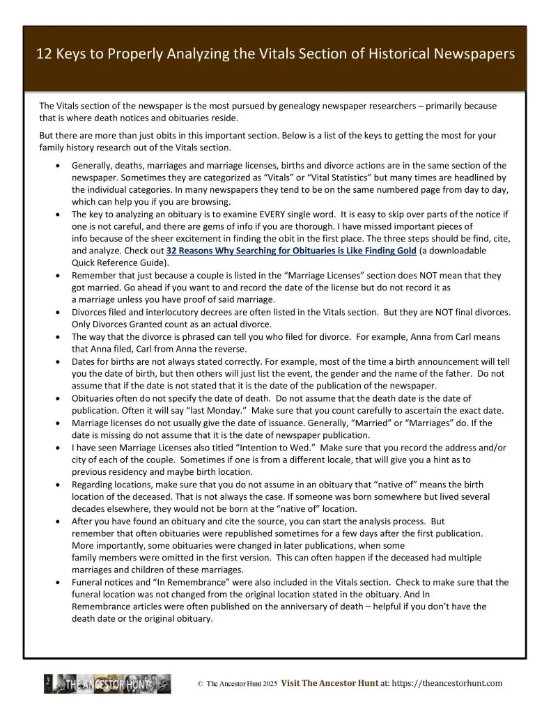But there are more than just obits in this important section. The Quicksheet discusses the keys to getting the most for your family history research out of the Vitals section, and analyzing properly what you find.