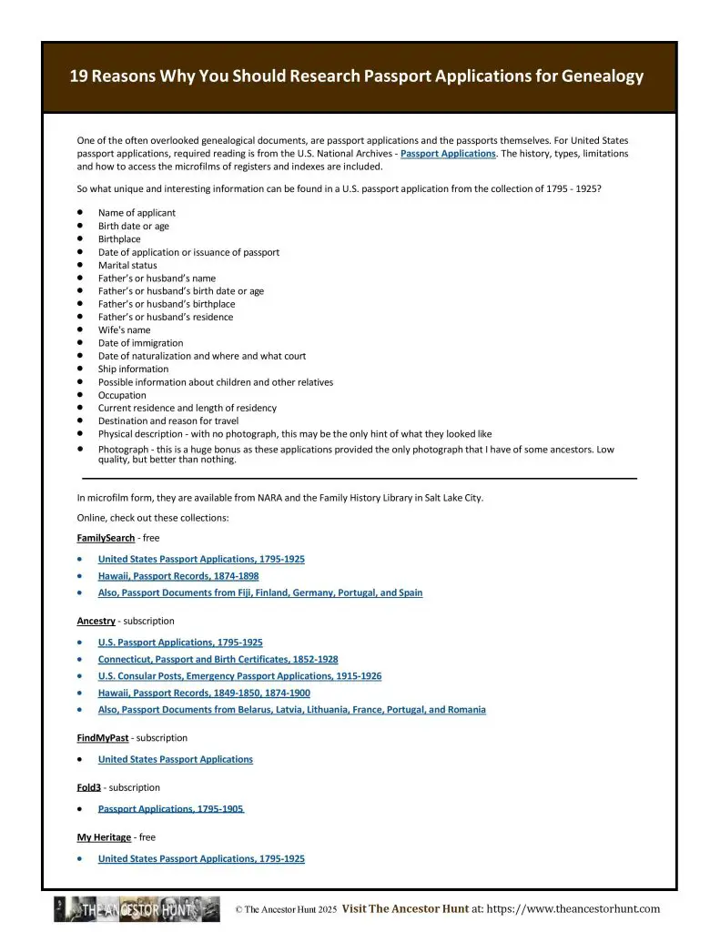 For United States passport applications, the required reading is from the U.S. National Archives – Passport Applications. The history, types, limitations, and how to access the microfilms of registers and indexes are included.