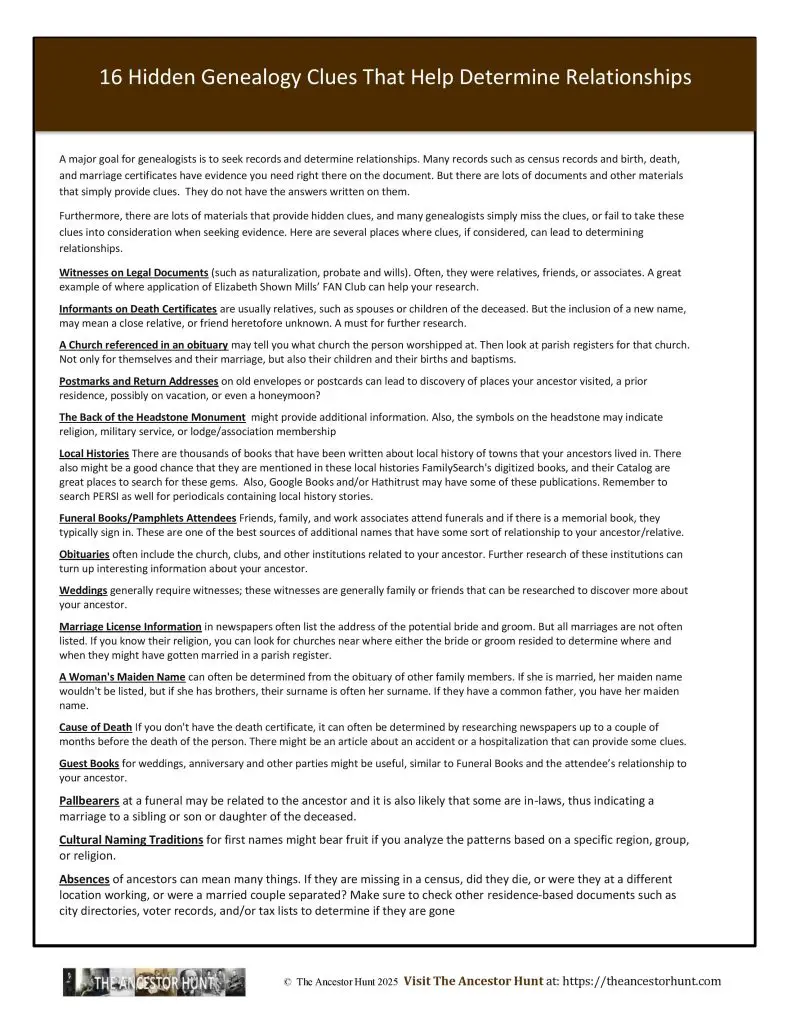 A major goal for genealogists is to seek records and determine relationships. Many records such as census records and birth, death, and marriage certificates have evidence you need right there on the document. But there are lots of documents and other materials that simply provide clues. They do not have the answers written on them.