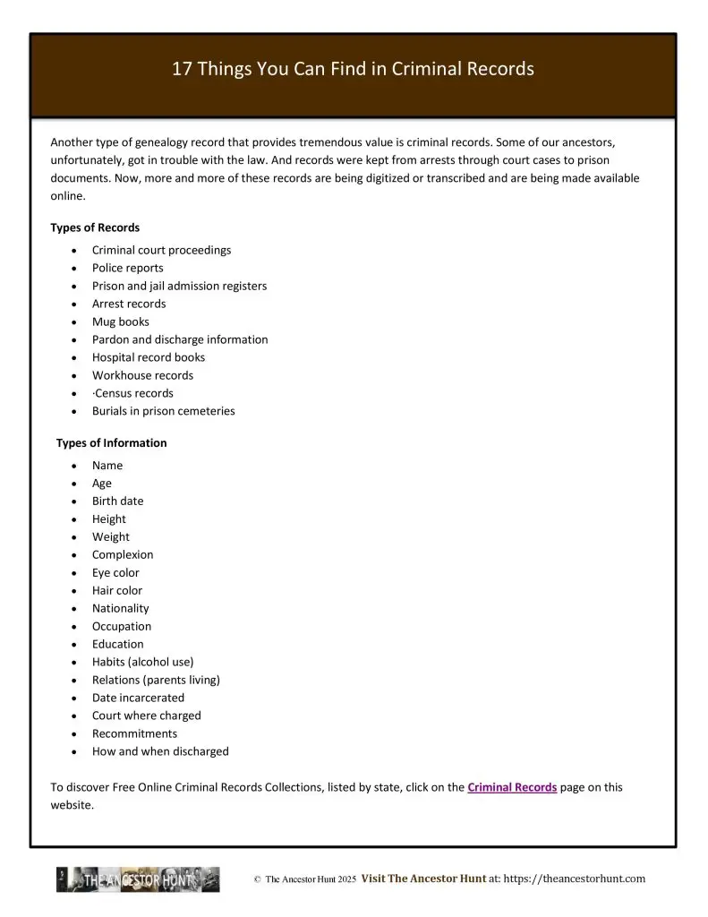 Another type of genealogy record that provides tremendous value is criminal records. Some of our ancestors, unfortunately, got in trouble with the law. And records were kept from arrests through court cases to prison documents. Now, more and more of these records are being digitized or transcribed and are being made available online.