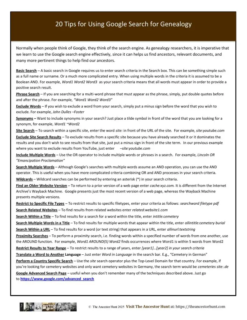 Google Search has become so ubiquitous that “Google it” is a part of our everyday language. Searching using Google has a variety of options that many researchers are not familiar with. Here are 20 different ways to use Google to search; some are especially helpful when doing genealogy research.