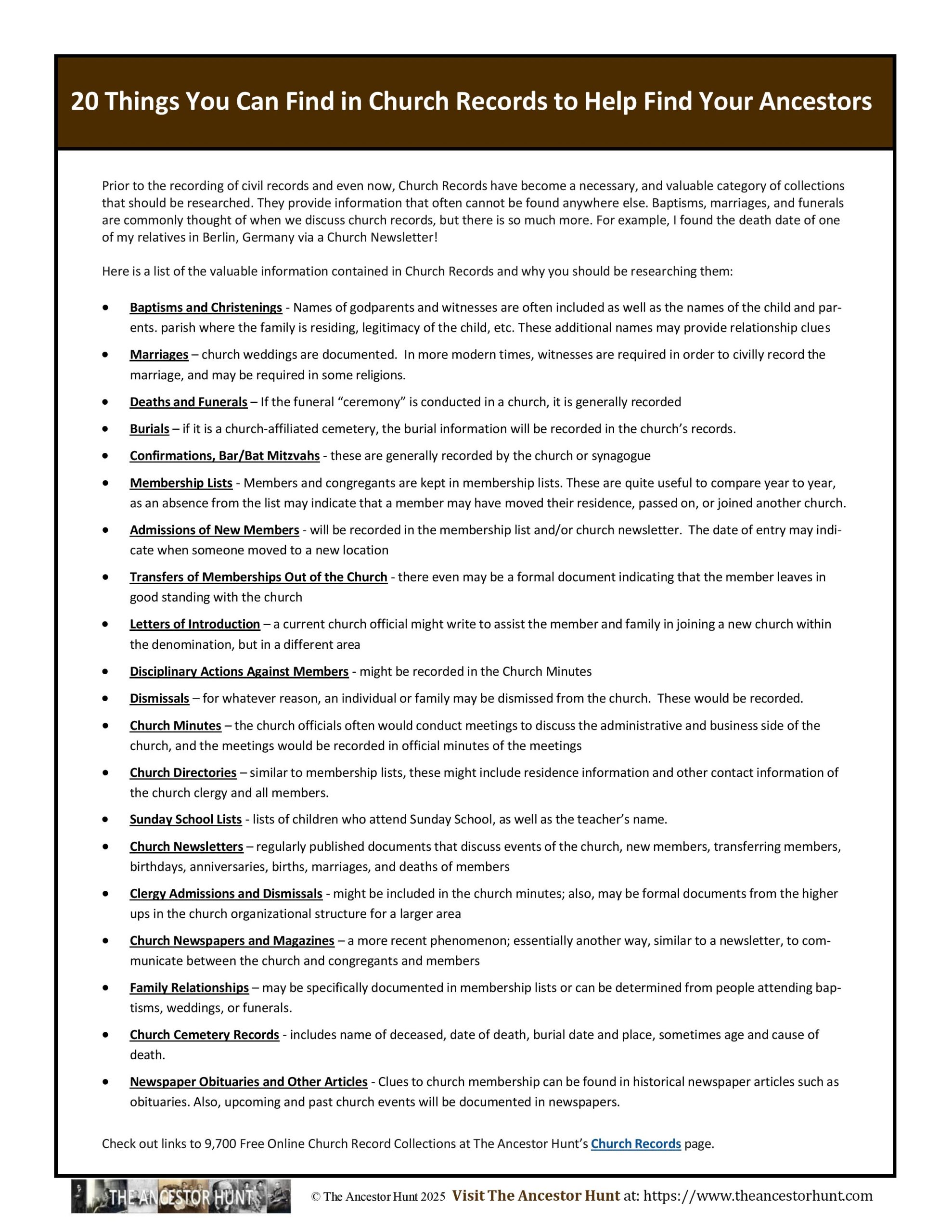 In the Quicksheet is a list of the valuable information contained in Church Records and why you should be researching them: