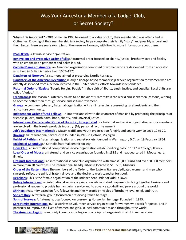One of the more interesting parts of our ancestors’ lives that we often discover only via their obituary, is their membership or attachment to a fraternal, ethnic, religious, or service organization or society. The Quicksheet contains 25 of the more common ones in the United States.