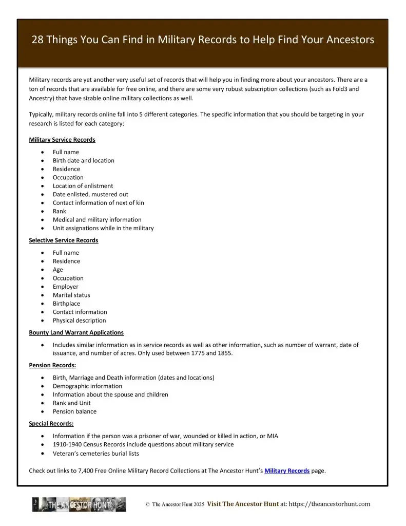 Military records are yet another very useful set of records that will help you in finding more about your ancestors. There are a ton of records that are available for free online, and there are some very robust collections (such as Fold3 and Ancestry) that have sizable online military collections as well.