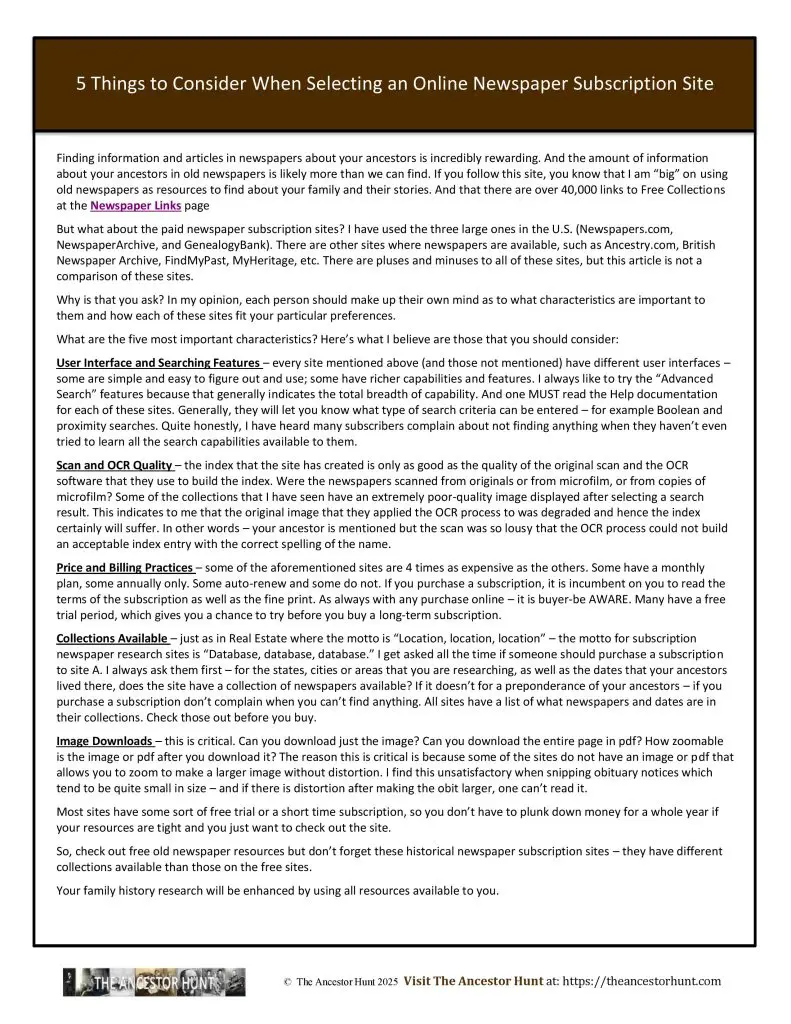 But what about the paid newspaper subscription sites? I have used the three large ones in the U.S. (Newspapers.com, NewspaperArchive, and GenealogyBank). There are other sites where newspapers are available, such as Ancestry.com, British Newspaper Archive, FindMyPast, MyHeritage, etc. There are pluses and minuses to all of these sites, but this article is not a comparison of these sites.