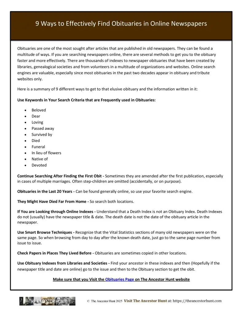 Obituaries are one of the most sought after articles that are published in old newspapers. They can be found a multitude of ways. If you are searching newspapers online, there are several methods to get you to the obituary faster and more effectively. There are thousands of indexes to newspaper obituaries that have been created by libraries, genealogical societies and from volunteers in a multitude of organizations and websites. Online search engines are valuable, especially since most obituaries in the past two decades appear in obituary and tribute websites only.