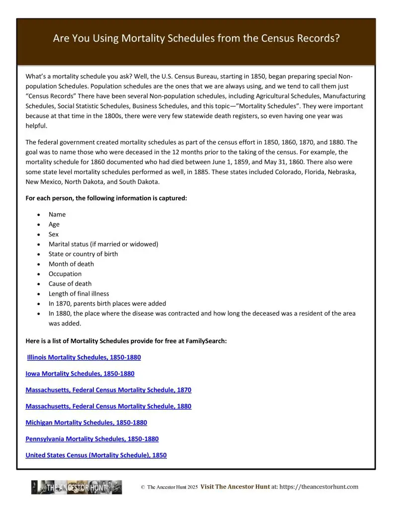 The federal government created mortality schedules as part of the census effort in 1850, 1860, 1870, and 1880. The goal was to name those who were deceased in the 12 months prior to the taking of the census.