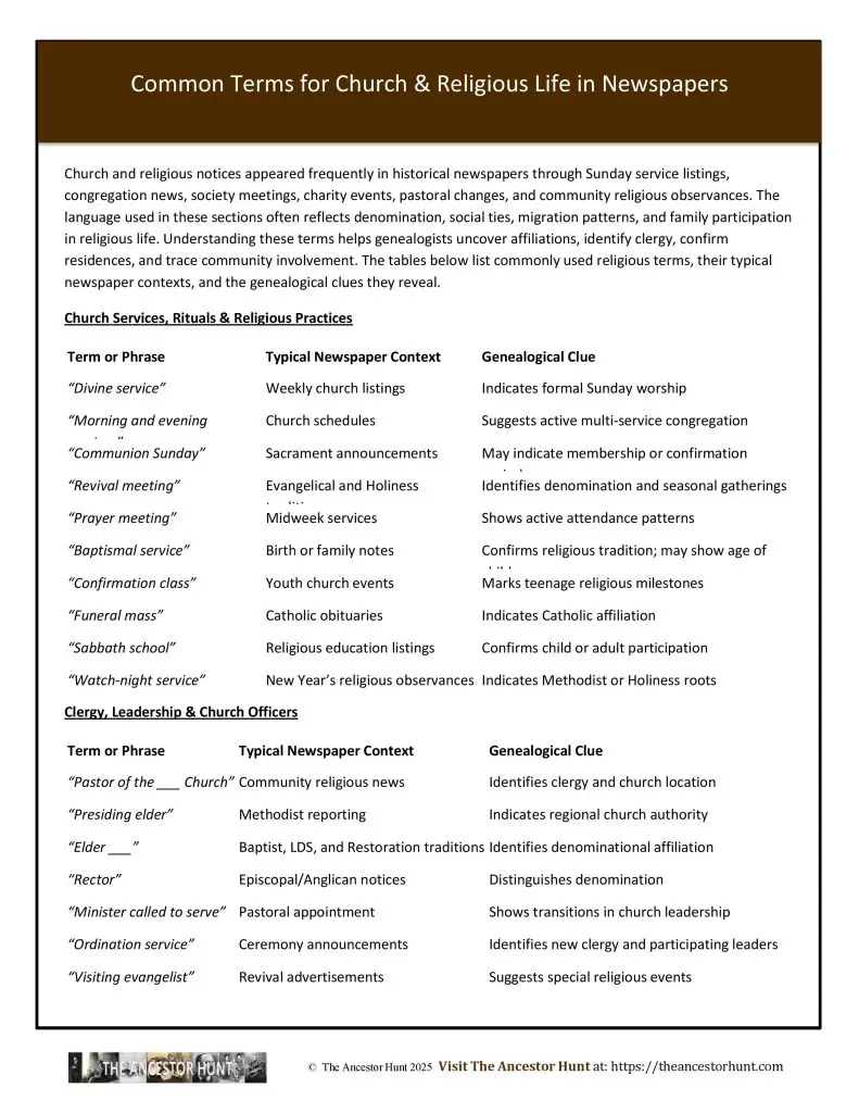 Church and religious notices appeared frequently in historical newspapers through Sunday service listings, congregation news, society meetings, charity events, pastoral changes, and community religious observances. The language used in these sections often reflects denomination, social ties, migration patterns, and family participation in religious life. Understanding these terms helps genealogists uncover affiliations, identify clergy, confirm residences, and trace community involvement. The tables in the Quicksheet list commonly used religious terms, their typical newspaper contexts, and the genealogical clues they reveal.