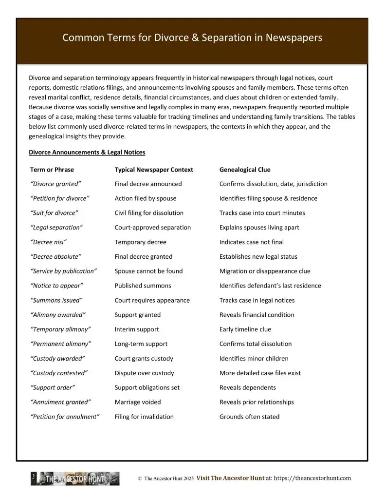 Divorce and separation terminology appears frequently in historical newspapers through legal notices, court reports, domestic relations filings, and announcements involving spouses and family members. These terms often reveal marital conflict, residence details, financial circumstances, and clues about children or extended family. Because divorce was socially sensitive and legally complex in many eras, newspapers frequently reported multiple stages of a case, making these terms valuable for tracking timelines and understanding family transitions. The tables below list commonly used divorce-related terms in newspapers, the contexts in which they appear, and the genealogical insights they provide.
