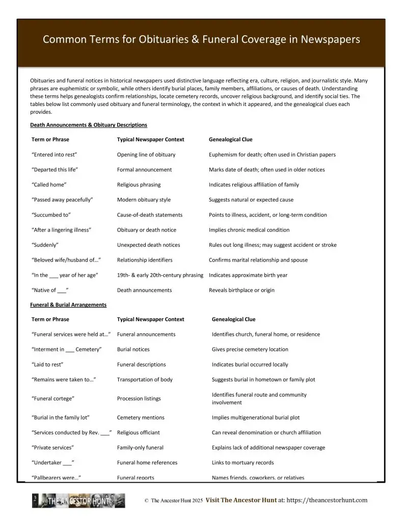 Obituaries and funeral notices in historical newspapers used distinctive language reflecting era, culture, religion, and journalistic style. Many phrases are euphemistic or symbolic, while others identify burial places, family members, affiliations, or causes of death. Understanding these terms helps genealogists confirm relationships, locate cemetery records, uncover religious background, and identify social ties. The tables below list commonly used obituary and funeral terminology, the context in which it appeared, and the genealogical clues each provides.