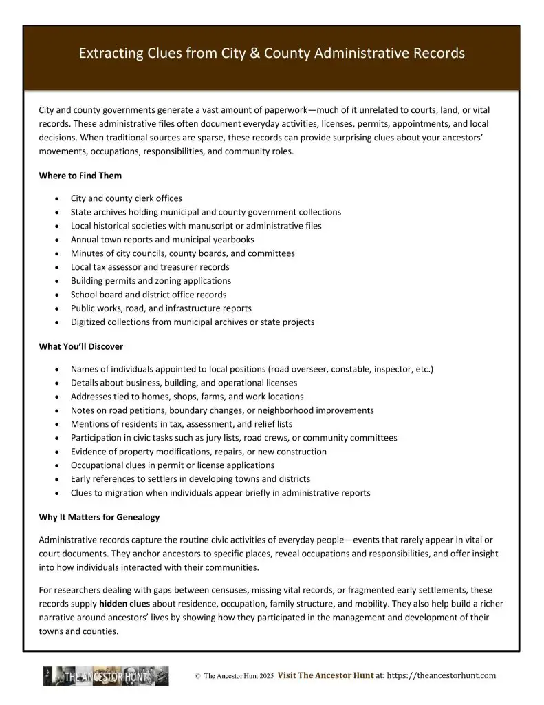 City and county governments generate a vast amount of paperwork—much of it unrelated to courts, land, or vital records. These administrative files often document everyday activities, licenses, permits, appointments, and local decisions. When traditional sources are sparse, these records can provide surprising clues about your ancestors’ movements, occupations, responsibilities, and community roles.
