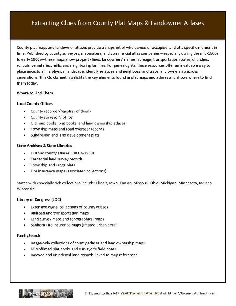 County plat maps and landowner atlases provide a snapshot of who owned or occupied land at a specific moment in time. Published by county surveyors, mapmakers, and commercial atlas companies—especially during the mid-1800s to early 1900s—these maps show property lines, landowners’ names, acreage, transportation routes, churches, schools, cemeteries, mills, and neighboring families. For genealogists, these resources offer an invaluable way to place ancestors in a physical landscape, identify relatives and neighbors, and trace land ownership across generations. This Quicksheet highlights the key elements found in plat maps and atlases and shows where to find them today.