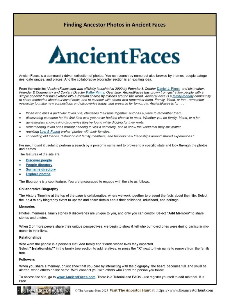 From the website: “AncientFaces.com was officially launched in 2000 by Founder & Creator Daniel J. Pinna, and his mother, Founder & Community and Content Director Kathy Pinna. Over time, AncientFaces has grown from just a few people with a simple concept that has evolved into a mission shared by millions around the world. AncientFaces is a family-friendly community to share memories about our loved ones, and to connect with others who remember them. Family, friend, or fan – remember yesterday to make new connections and discoveries today, and preserve for tomorrow.