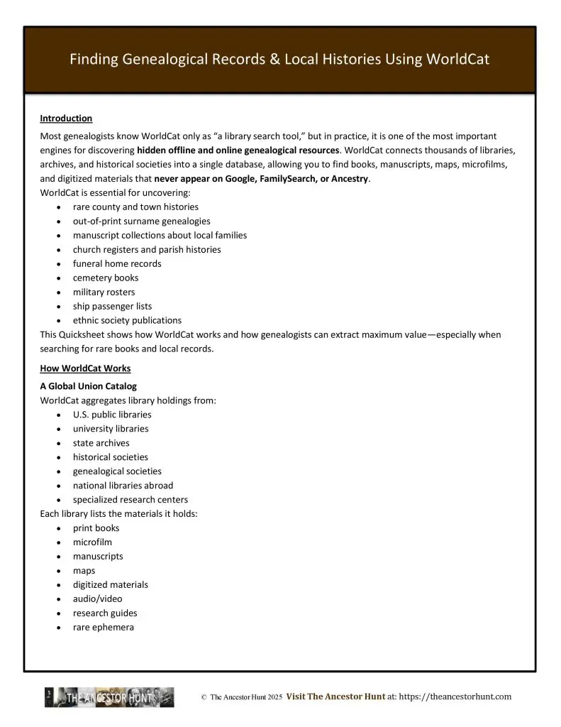 Most genealogists know WorldCat only as “a library search tool,” but in practice, it is one of the most important engines for discovering hidden offline and online genealogical resources. WorldCat connects thousands of libraries, archives, and historical societies into a single database, allowing you to find books, manuscripts, maps, microfilms, and digitized materials that never appear on Google, FamilySearch, or Ancestry.