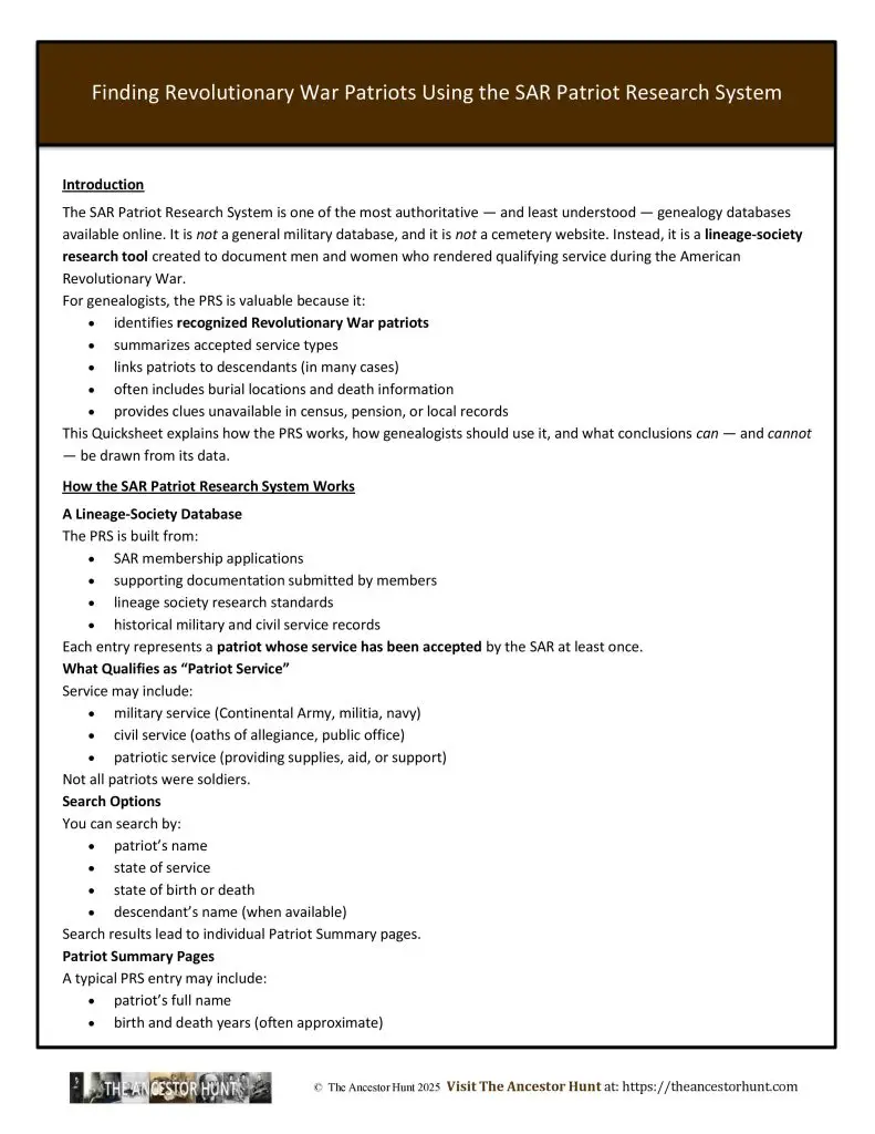 The SAR Patriot Research System is one of the most authoritative — and least understood — genealogy databases available online. It is not a general military database, and it is not a cemetery website. Instead, it is a lineage-society research tool created to document men and women who rendered qualifying service during the American Revolutionary War.