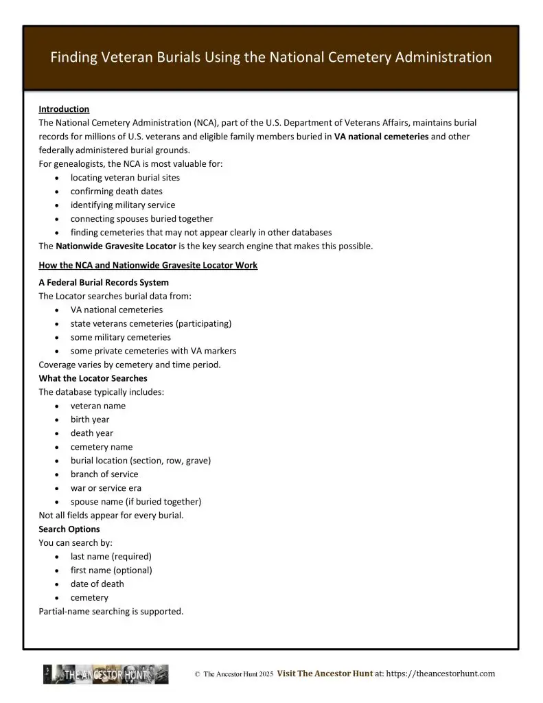 The National Cemetery Administration (NCA), part of the U.S. Department of Veterans Affairs, maintains burial records for millions of U.S. veterans and eligible family members buried in VA national cemeteries and other federally administered burial grounds.