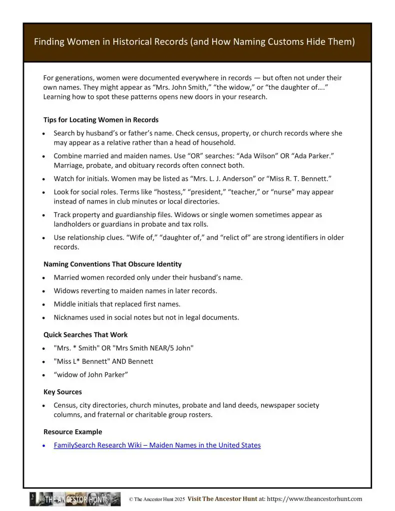 Learn the tips for locating women in records and the naming conventions that obscure identity in the Quicksheet.