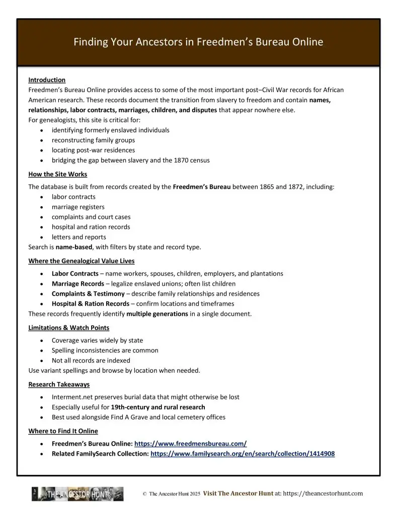 Freedmen’s Bureau Online provides access to some of the most important post–Civil War records for African American research. These records document the transition from slavery to freedom and contain names, relationships, labor contracts, marriages, children, and disputes that appear nowhere else.