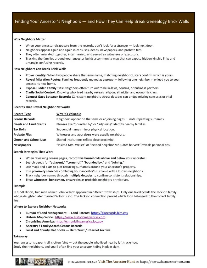 When your ancestor disappears from the records, don’t look for a stranger — look next door. Neighbors appear again and again in censuses, deeds, newspapers, and probate files. They often migrated together, intermarried, and served as witnesses or executors. Tracking the families around your ancestor builds a community map that can expose hidden kinship links and untangle confusing records.
