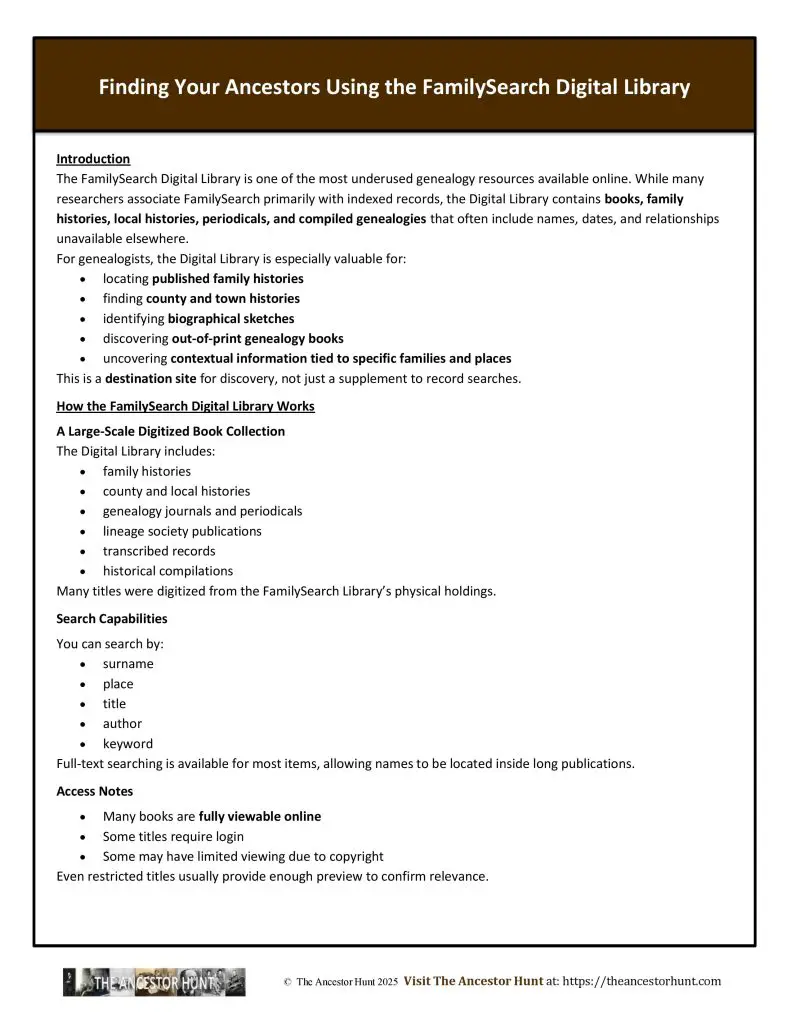 The FamilySearch Digital Library is one of the most underused genealogy resources available online. While many researchers associate FamilySearch primarily with indexed records, the Digital Library contains books, family histories, local histories, periodicals, and compiled genealogies that often include names, dates, and relationships unavailable elsewhere.