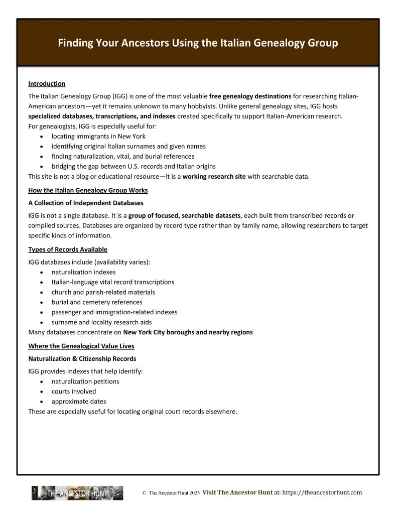 The Italian Genealogy Group (IGG) is one of the most valuable free genealogy destinations for researching Italian-American ancestors—yet it remains unknown to many hobbyists. Unlike general genealogy sites, IGG hosts specialized databases, transcriptions, and indexes created specifically to support Italian-American research.