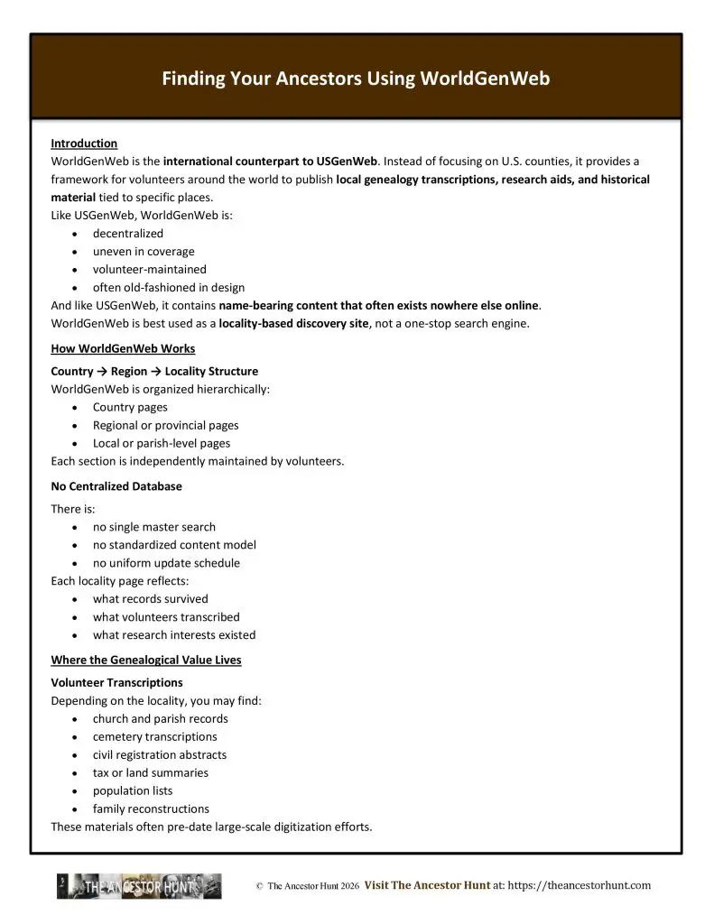 WorldGenWeb is the international counterpart to USGenWeb. Instead of focusing on U.S. counties, it provides a framework for volunteers around the world to publish local genealogy transcriptions, research aids, and historical material tied to specific places.