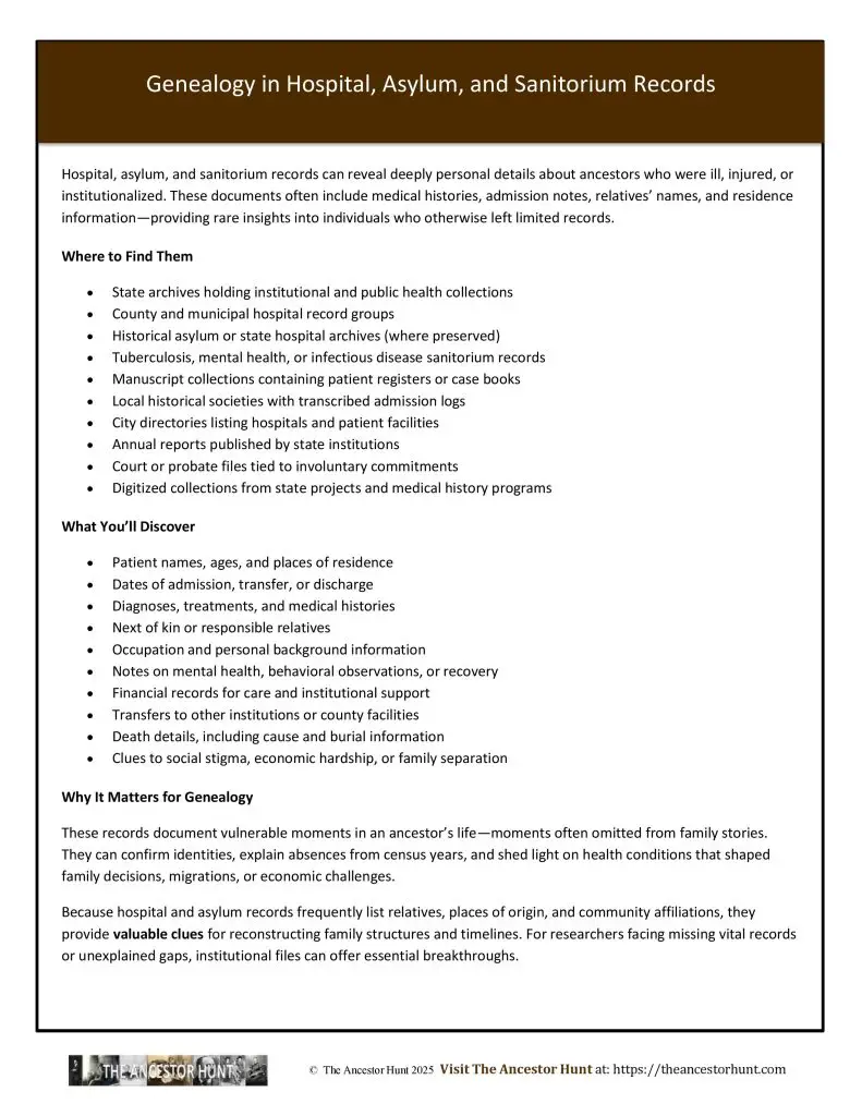 Hospital, asylum, and sanitorium records can reveal deeply personal details about ancestors who were ill, injured, or institutionalized. These documents often include medical histories, admission notes, relatives’ names, and residence information—providing rare insights into individuals who otherwise left limited records.