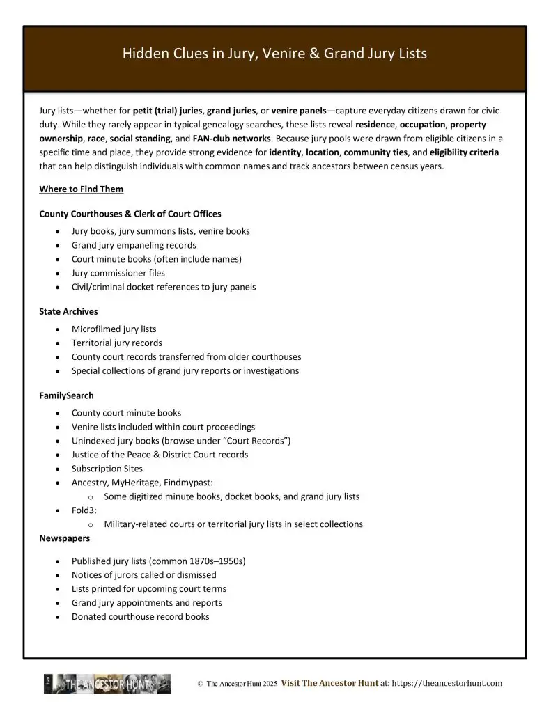 Jury lists—whether for petit (trial) juries, grand juries, or venire panels—capture everyday citizens drawn for civic duty. While they rarely appear in typical genealogy searches, these lists reveal residence, occupation, property ownership, race, social standing, and FAN-club networks. Because jury pools were drawn from eligible citizens in a specific time and place, they provide strong evidence for identity, location, community ties, and eligibility criteria that can help distinguish individuals with common names and track ancestors between census years.