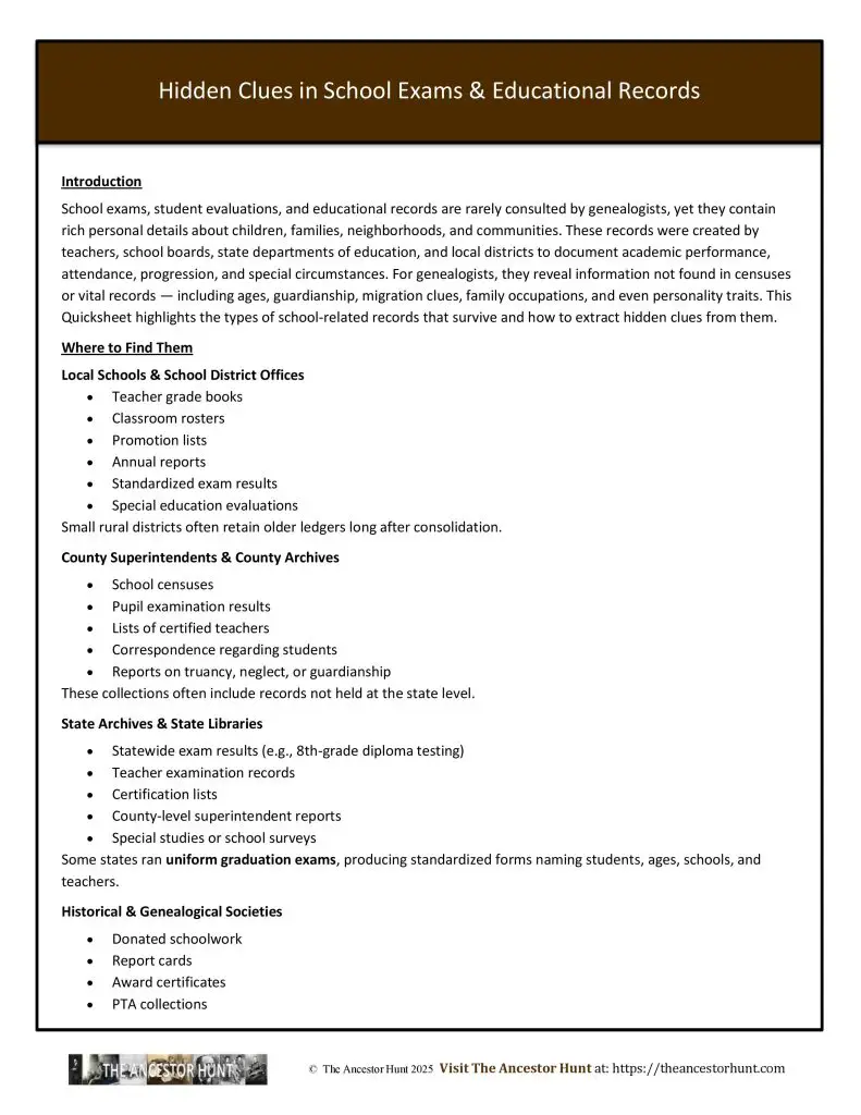 School exams, student evaluations, and educational records are rarely consulted by genealogists, yet they contain rich personal details about children, families, neighborhoods, and communities. These records were created by teachers, school boards, state departments of education, and local districts to document academic performance, attendance, progression, and special circumstances. For genealogists, they reveal information not found in censuses or vital records — including ages, guardianship, migration clues, family occupations, and even personality traits. This Quicksheet highlights the types of school-related records that survive and how to extract hidden clues from them.