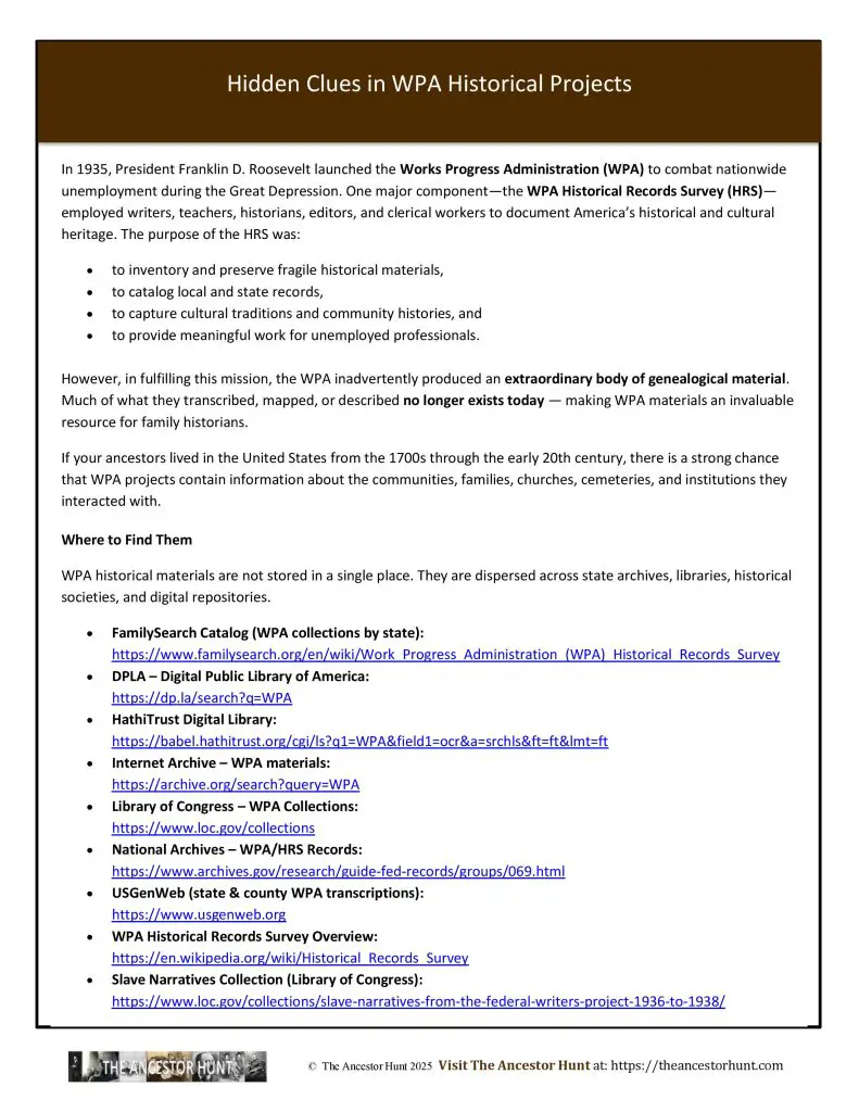 If your ancestors lived in the United States from the 1700s through the early 20th century, there is a strong chance that WPA projects contain information about the communities, families, churches, cemeteries, and institutions they interacted with.