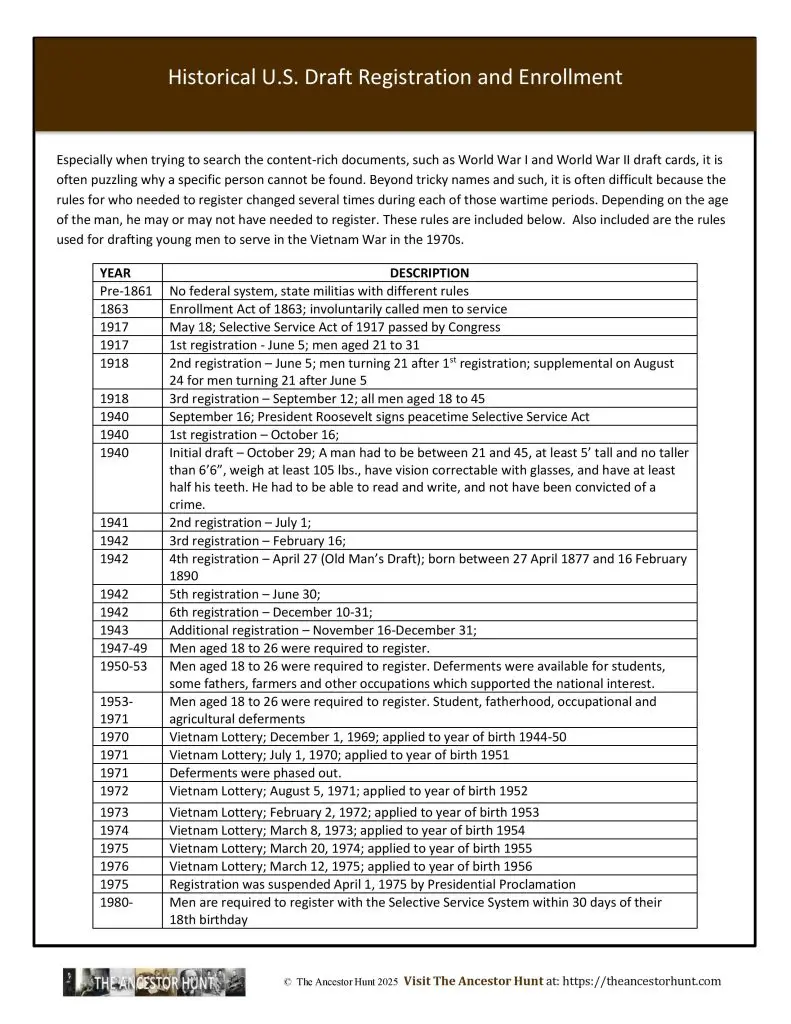 Especially when trying to search the content-rich documents, such as World War I and World War II draft cards, it is often puzzling why a specific person cannot be found. Beyond tricky names and such, it is often difficult because the rules for who needed to register changed several times during each of those wartime periods. Depending on the age of the man, he may or may not have needed to register.