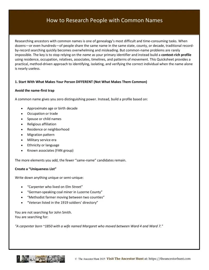 Researching ancestors with common names is one of genealogy’s most difficult and time-consuming tasks. When dozens—or even hundreds—of people share the same name in the same state, county, or decade, traditional record-by-record searching quickly becomes overwhelming and misleading. But common-name problems are rarely impossible. The key is to stop relying on the name as your primary identifier and instead build a context-rich profile using residence, occupation, relatives, associates, timelines, and patterns of movement. This Quicksheet provides a practical, method-driven approach to identifying, isolating, and verifying the correct individual when the name alone is nearly useless.