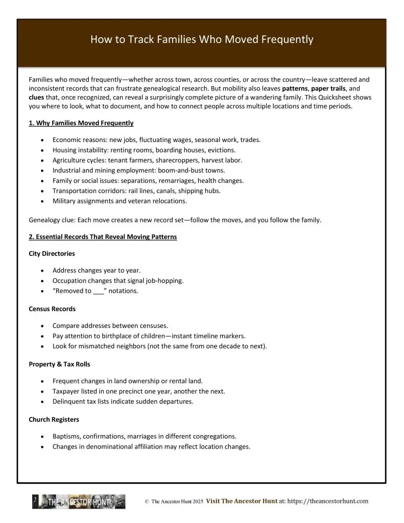 Families who moved frequently—whether across town, across counties, or across the country—leave scattered and inconsistent records that can frustrate genealogical research. But mobility also leaves patterns, paper trails, and clues that, once recognized, can reveal a surprisingly complete picture of a wandering family. This Quicksheet shows you where to look, what to document, and how to connect people across multiple locations and time periods.