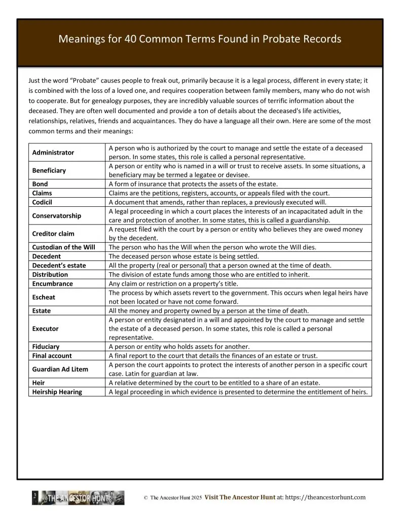Just the word “Probate” causes people to freak out, primarily because it is a legal process, different in every state; it is combined with the loss of a loved one and requires cooperation between family members, many of whom do not wish to cooperate. But for genealogy purposes, they are incredibly valuable sources of terrific information about the deceased. They are often well-documented and provide a ton of details about the deceased’s life activities, relationships, relatives, friends, and acquaintances. They do have a language all their own.