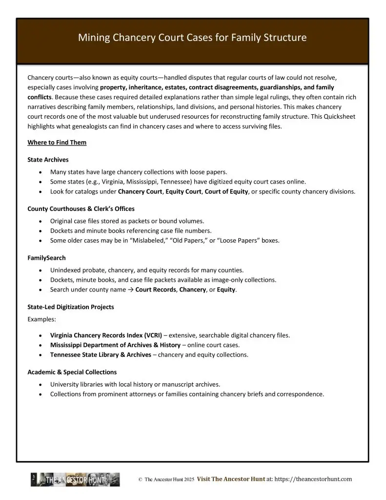 Chancery courts—also known as equity courts—handled disputes that regular courts of law could not resolve, especially cases involving property, inheritance, estates, contract disagreements, guardianships, and family conflicts. Because these cases required detailed explanations rather than simple legal rulings, they often contain rich narratives describing family members, relationships, land divisions, and personal histories. This makes chancery court records one of the most valuable but underused resources for reconstructing family structure. This Quicksheet highlights what genealogists can find in chancery cases and where to access surviving files.