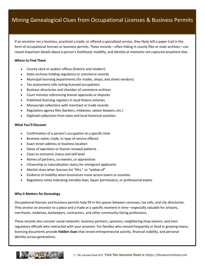 If an ancestor ran a business, practiced a trade, or offered a specialized service, they likely left a paper trail in the form of occupational licenses or business permits. These records—often hiding in county files or state archives—can reveal important details about a person’s livelihood, mobility, and identity at moments not captured anywhere else.