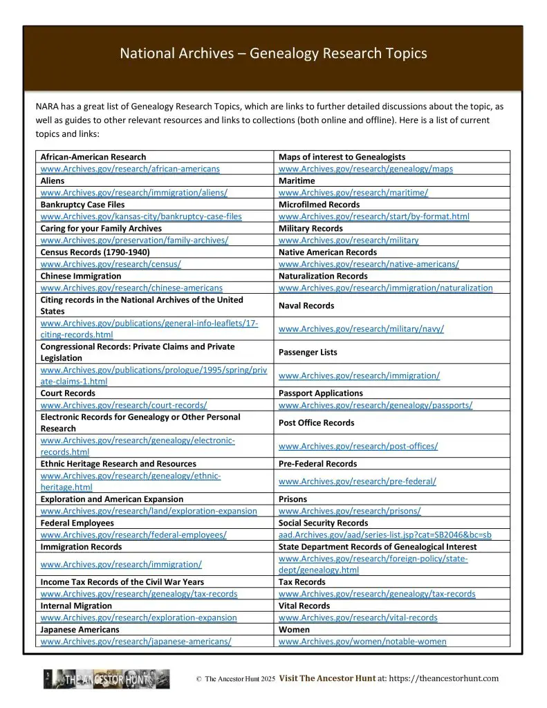 The following PDF lists all the Genealogy Topics, along with the inks to the NARA site.