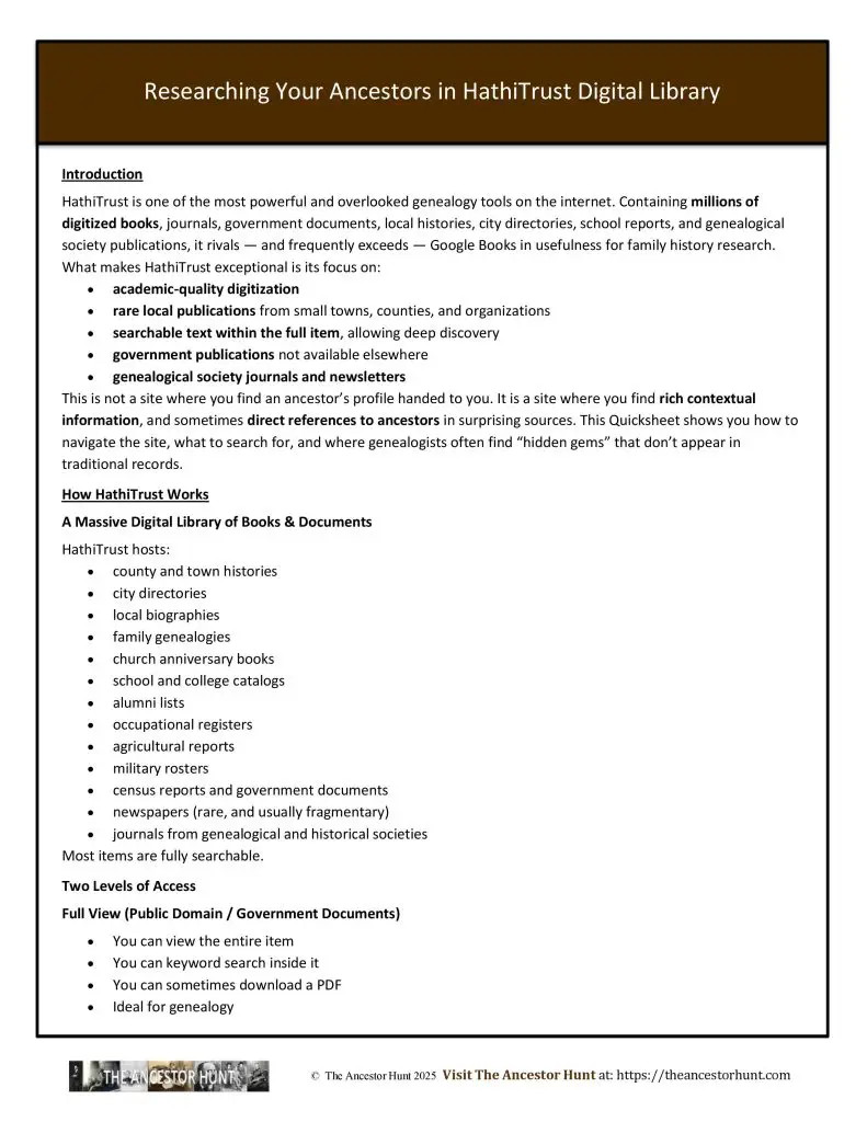 HathiTrust is one of the most powerful and overlooked genealogy tools on the internet. Containing millions of digitized books, journals, government documents, local histories, city directories, school reports, and genealogical society publications, it rivals — and frequently exceeds — Google Books in usefulness for family history research.