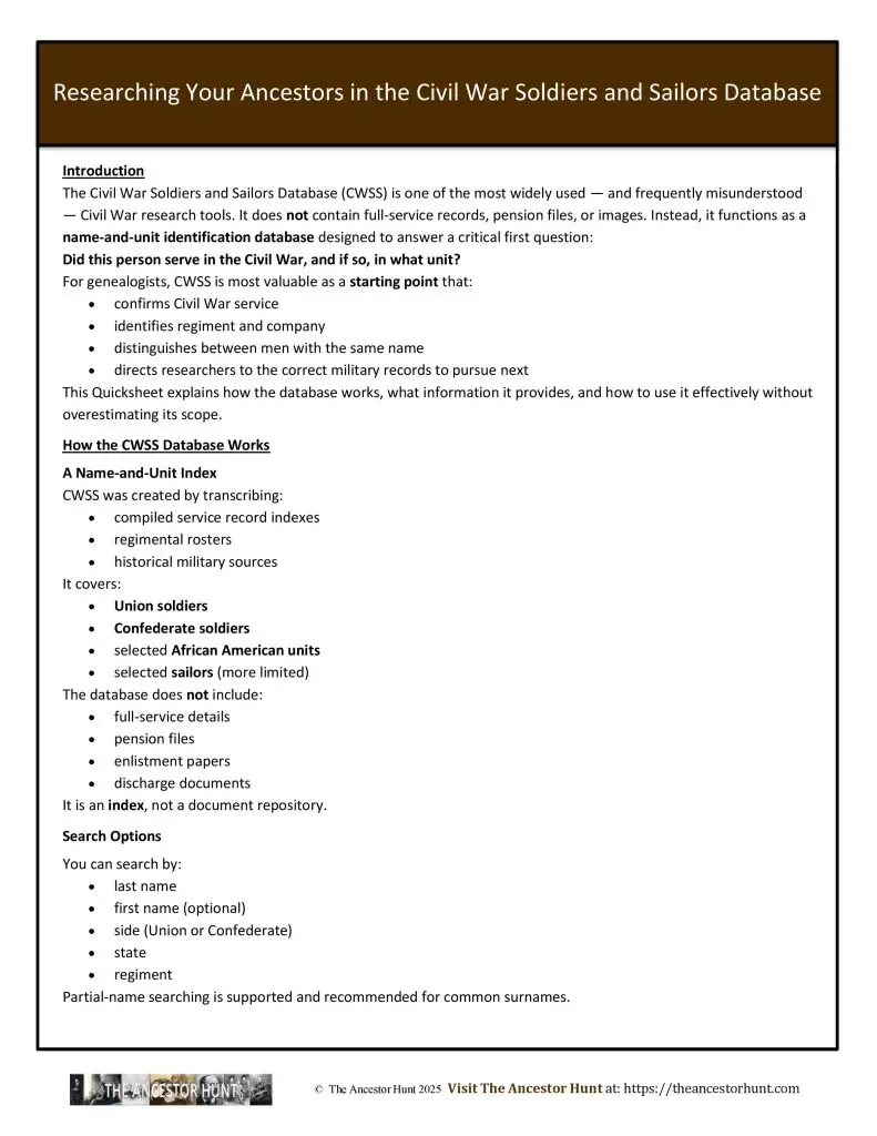The Civil War Soldiers and Sailors Database (CWSS) is one of the most widely used — and frequently misunderstood — Civil War research tools. It does not contain full-service records, pension files, or images. Instead, it functions as a name-and-unit identification database designed to answer a critical first question: