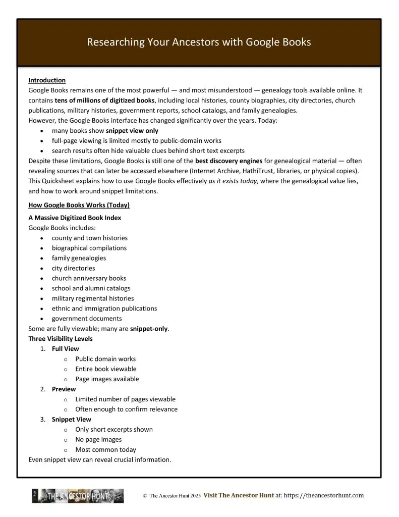Despite these limitations, Google Books is still one of the best discovery engines for genealogical material — often revealing sources that can later be accessed elsewhere (Internet Archive, HathiTrust, libraries, or physical copies). This Quicksheet explains how to use Google Books effectively as it exists today, where the genealogical value lies, and how to work around snippet limitations.