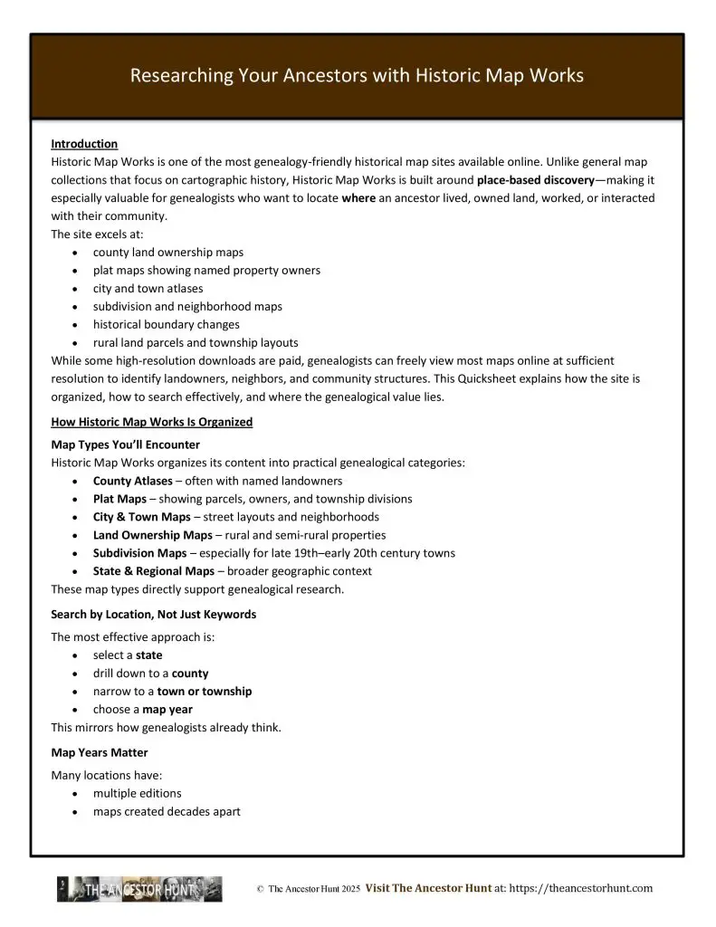Historic Map Works is one of the most genealogy-friendly historical map sites available online. Unlike general map collections that focus on cartographic history, Historic Map Works is built around place-based discovery—making it especially valuable for genealogists who want to locate where an ancestor lived, owned land, worked, or interacted with their community.