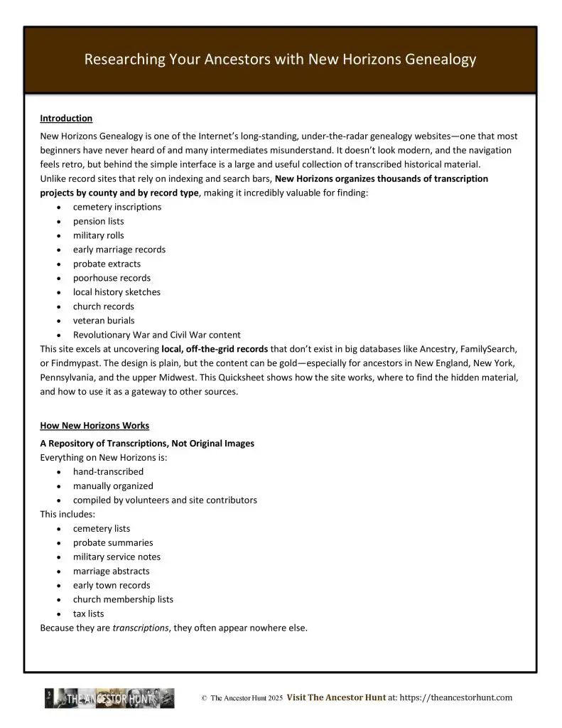 New Horizons Genealogy is one of the Internet’s long-standing, under-the-radar genealogy websites. It doesn’t look modern, and the navigation feels retro, but behind the simple interface is a large and useful collection of transcribed historical material. Unlike record sites that rely on indexing and search bars, New Horizons organizes thousands of transcription projects by county and by record type. This site excels at uncovering local, off-the-grid records that don’t exist in big databases.