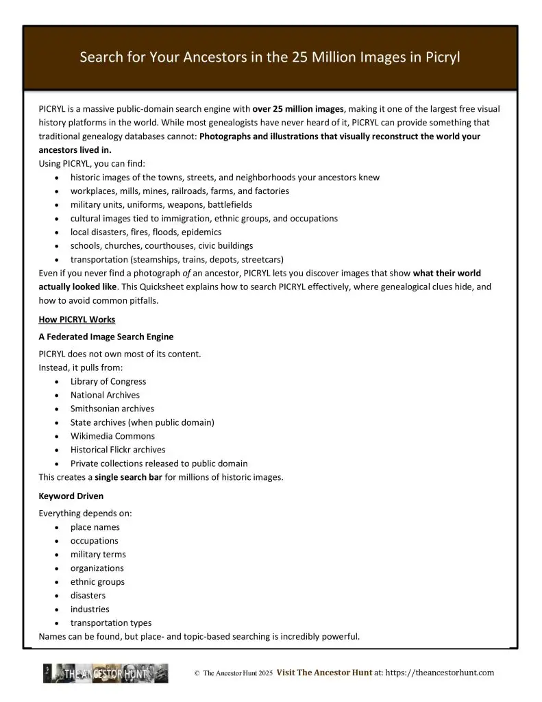 Even if you never find a photograph of an ancestor, PICRYL lets you discover images that show what their world actually looked like. This Quicksheet explains how to search PICRYL effectively, where genealogical clues hide, and how to avoid common pitfalls.