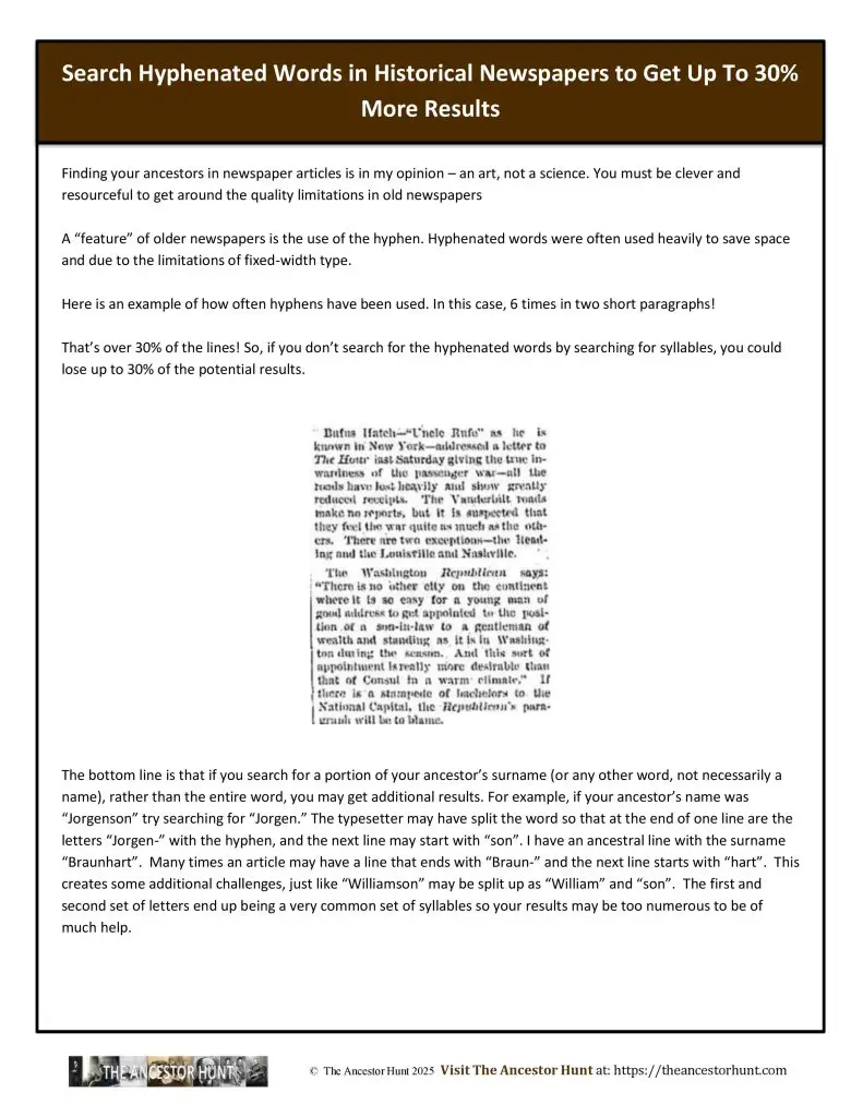 This Quicksheet includes a description, with examples, of the benefits of searching for hyphenated words in your online search of old newspapers. It will get you as much as 30% more results. Guaranteed!