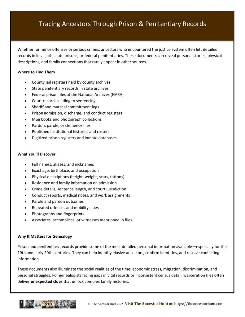 Whether for minor offenses or serious crimes, ancestors who encountered the justice system often left detailed records in local jails, state prisons, or federal penitentiaries. These documents can reveal personal stories, physical descriptions, and family connections that rarely appear in other sources.