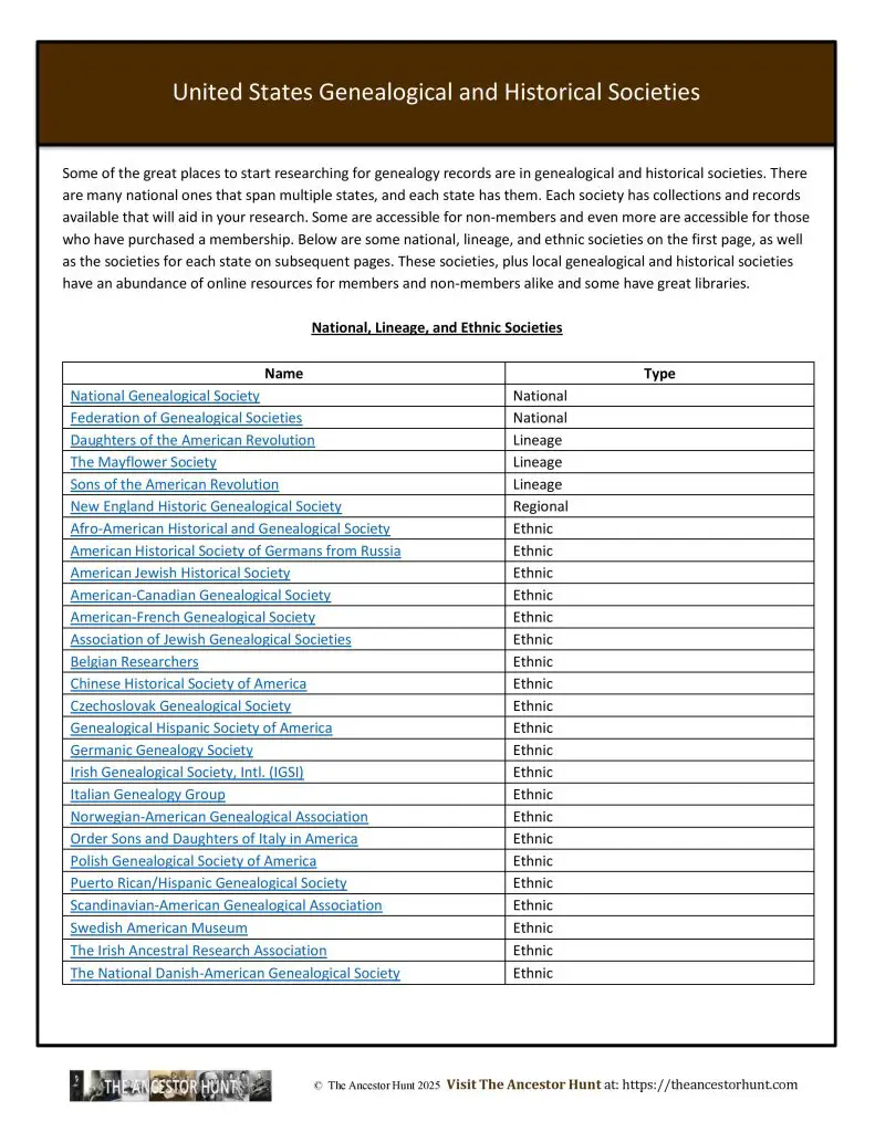 Some great places to start researching genealogy records are in genealogical and historical societies. Many national ones span multiple states, and each state has them. Each society has collections and records available that will aid in your research. Some are accessible for non-members and even more are accessible for those who have purchased a membership. Below are some national, lineage, and ethnic societies on the first page and the societies for each state on subsequent pages. These societies, plus local genealogical and historical societies have an abundance of online resources for members and non-members alike and some have great libraries.