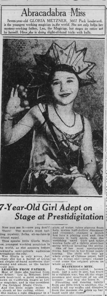 “Find newspaper articles about my cousin, Gloria Metzner, whose stage name was Gloria Dea, who was born in 1922 and passed away in 2023? She was a magician and an actress. She was born in Oakland, California, and died in Las Vegas, Nevada. Report the newspaper title and date”
