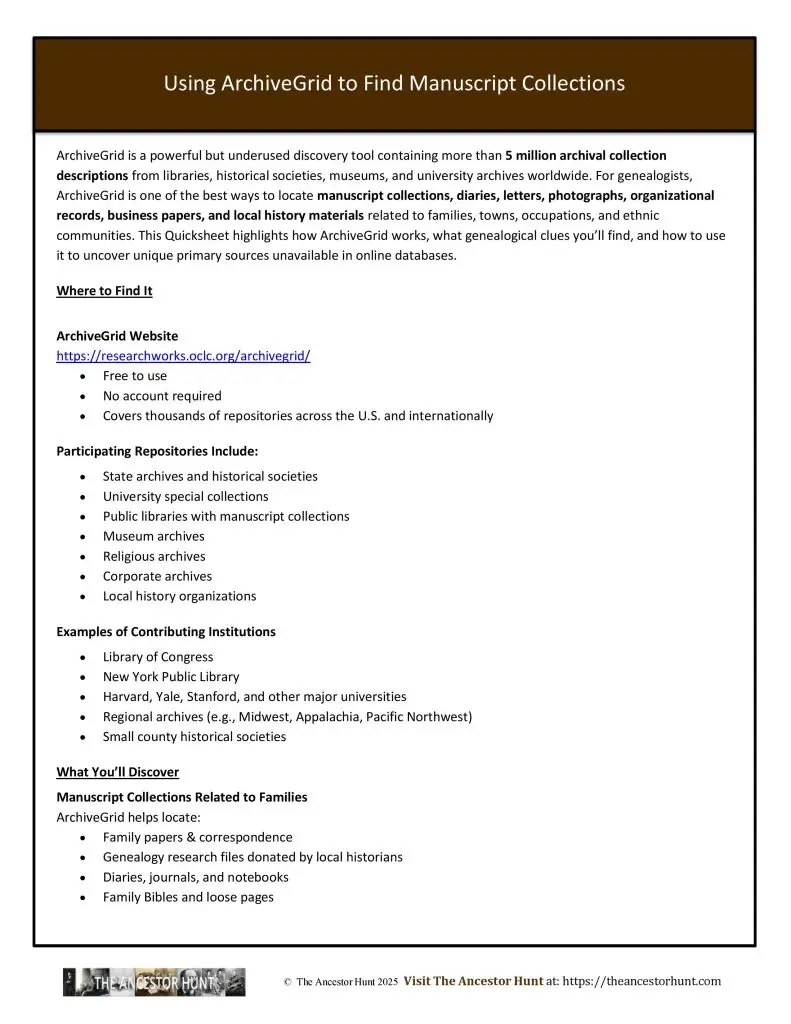 ArchiveGrid is a powerful but underused discovery tool containing more than 5 million archival collection descriptions from libraries, historical societies, museums, and university archives worldwide. For genealogists, ArchiveGrid is one of the best ways to locate manuscript collections, diaries, letters, photographs, organizational records, business papers, and local history materials related to families, towns, occupations, and ethnic communities. This Quicksheet highlights how ArchiveGrid works, what genealogical clues you’ll find, and how to use it to uncover unique primary sources unavailable in online databases.