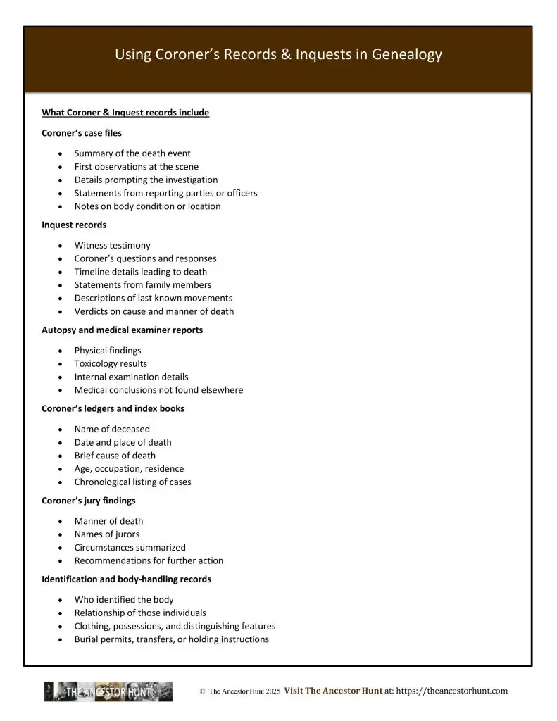 Coroner’s records and inquest files provide some of the most revealing details about sudden, unexpected, or unexplained deaths. These records can identify relatives, neighbors, employers, residences, and social networks, and often describe events that never appear in other sources. By understanding the structure and terminology of coroner investigations, genealogists can uncover valuable clues that help explain an ancestor’s final days and connect them to additional local records.