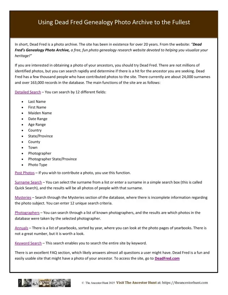 In short, Dead Fred is a photo archive. The site has been in existence for over 20 years. From the website: “Dead Fred’s Genealogy Photo Archive, a free, fun photo genealogy research website devoted to helping you visualize your heritage!”